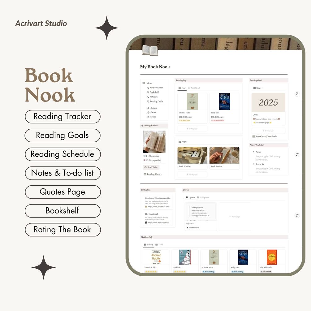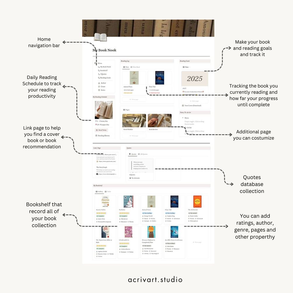 Transform your reading life with comprehensive Book Nook Notion template - your all-in-one solution for tracking, planning, and track your reading journey.
